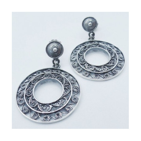 Very pretty silver earrings made by an artisanal workshop in northern Portugal using ancestral techniques. This “Roda” (wheel) model is very classy. Filigree is a very typical technique of Portuguese goldsmithing. In Portugal, filigree pieces dating from 2500-2000 BC have been found! Portuguese coins are recognized for their high quality. The delicate use of very fine wires gives these jewels a rare elegance. The result is a true little work of art, each piece of jewelry unlike any other, because it was handmade by an artisan. Weight: 7.40 g Material: silver Silver color Size: approximately 35mm (height) - 25mm (width) Located in the heart of the “city of gold” of Gondomar, very close to Porto, this artisanal manufacturing workshop was founded in 1953 by Joaquim de Sousa Monteiro and passed down from generation to generation within the same family, in order to preserve traditional production. The strong point of this company is the Portuguese watermark. With 27 employees, they produce in their workshops a wide range of products at competitive prices, ranging from fully manual and traditional production to mass production of items.