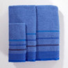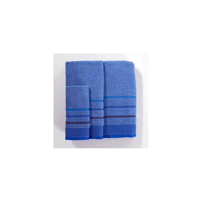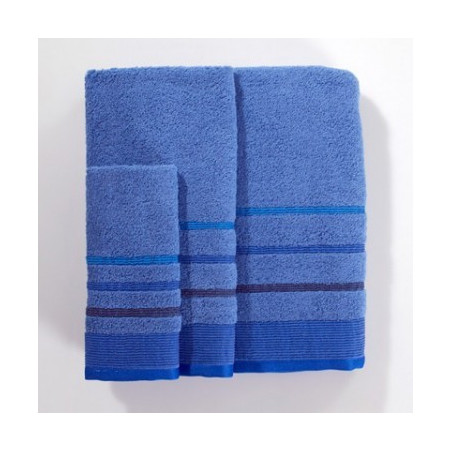 3 blue cotton bath towels of 500 g/m2. Presentation in bag. 1 guest towel: 35cm x 50 cm 1 bath towel: 50cm x 100cm 1 bath towel: 100cm x 150cm