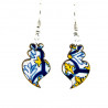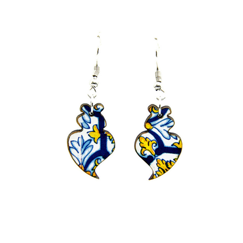Le cœur de Viana est originaire de la ville de Viana do Castelo, représente l'amour, la dévotion et le courage, il est profondément ancré dans la culture portugaise et est souvent offert en signe d'affection. Les azulejos sont des carreaux de faïence décoratifs typiques du Portugal, utilisés pour orner les façades des bâtiments, leurs motifs colorés et géométriques racontent souvent des histoires ou représentent des scènes de la vie quotidienne. Ces boucles d'oreilles ont la forme du Cœur de Viana, avec des motifs qui rappellent les azulejos rouges du Portugal, elles sont pendantes, ce qui leur donne un mouvement élégant. Les couleurs sont vives, et fidèles aux azulejos.