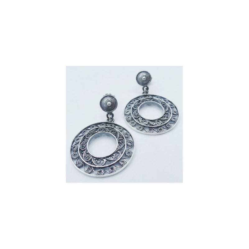 Très jolies boucles d'oreilles en argent réalisées par un atelier artisanal du nord du Portugal selon des techniques ancestrales. Ce modèle "Roda" (roue) est très classe.