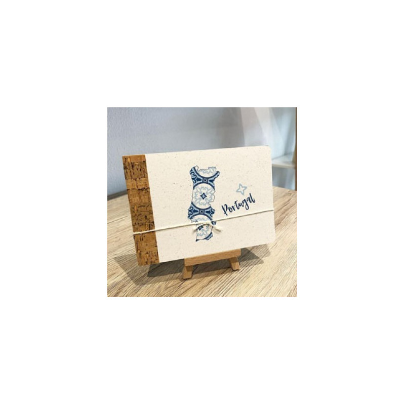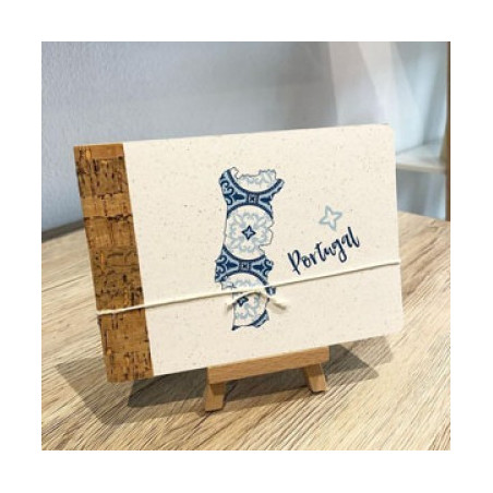 Carnet 100% naturel format A6 (15 cm x 10 cm) avec pour illustration la carte du Portugal avec à l'intérieur un motif d'azulejos. Ce carnet comporte 48 pages couleur ivoire (80g) en papier recyclé. La couverture est rigide en papier naturel à base de houblon et de malt 280g. 100% fait main. La reluire est en liège.