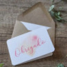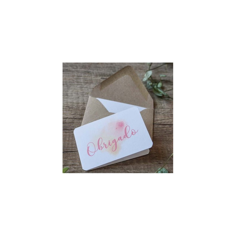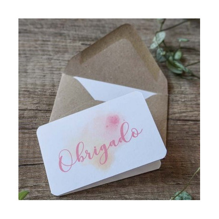 La taille de cette mini carte est de 8,50 cm x 5,40 cm, le message inscrit sur la mini-carte est "Obrigado", les bords sont arrondis, le papier Coton utilisé est de 300g, la mini enveloppe est en papier kraft.